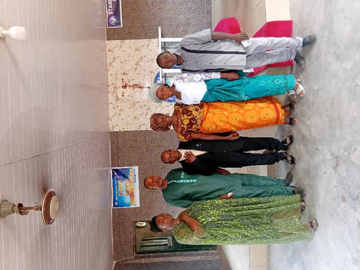 Six individuals are depicted standing in a line, facing forward, within an indoor or semi-enclosed space in Adankolo, Nigeria