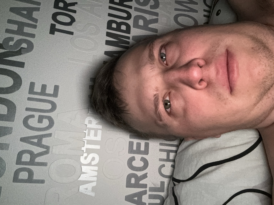 A man's face is captured close-up. His skin tone is fair, with visible stubble. He has short, light-brown hair and green eyes. He is lying on a pillow with black stripes on a white background. The background features a gray surface covered in the names of cities like London, Prague, Amsterdam, and Barcelona in different shades. The image is slightly rotated.