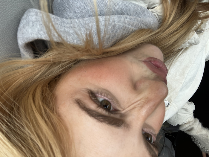 The image presents a close-up, tilted portrait of one female individual, occupying the majority of the frame. The specific location within Chaoyang District, China, cannot be determined from the visual information provided. The individual has fair skin with blush visible on the right cheek. Her brown eyes are open, and eyebrows are defined. The nose is visibly scrunched, producing wrinkles on the bridge and sides. The lips are pursed forward in a "pouting" gesture, coated with a matte pink lip product. Long, light brown hair extends across the lower right portion of the frame, resting on clothing. She wears a light-colored outer garment, possibly a white or off-white jacket or shirt, with a circular button visible on the upper left. A grey hooded garment is visible underneath the hair on the lower right. A segment of a light-colored, possibly textured or embellished sleeve, featuring reflective elements, is present on the far upper left. The background is indistinct; the left side is dark, while the right side shows a plain, light-colored surface, suggesting an indoor environment, possibly within a vehicle or room. The individual is actively making a facial expression characterized by the scrunched nose and pursed lips. No interactions with other individuals are depicted.