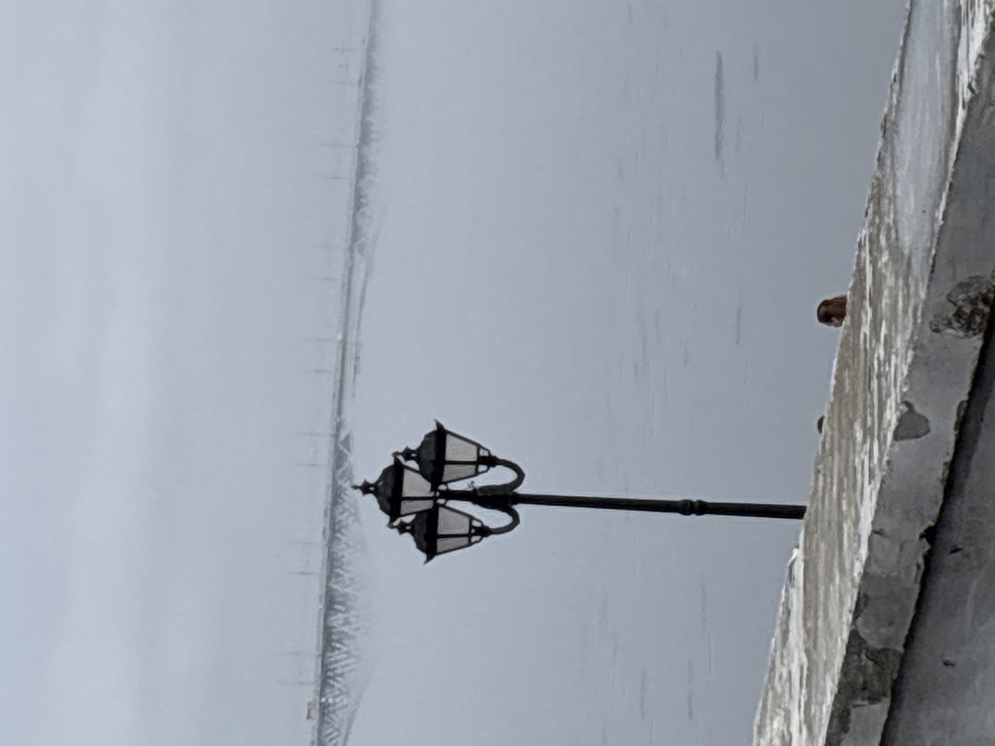 The image depicts a street lamp with three lamps in the foreground, adjacent to a concrete wall. Beyond the lamp and the wall, there is a body of water, possibly a river or a bay, with a bridge faintly visible in the distance through a dense fog or haze. A human head is visible above the wall in the upper right corner of the image. The weather appears to be overcast or foggy, creating a subdued, monochromatic color scheme. The location is Unknown, Unknown.