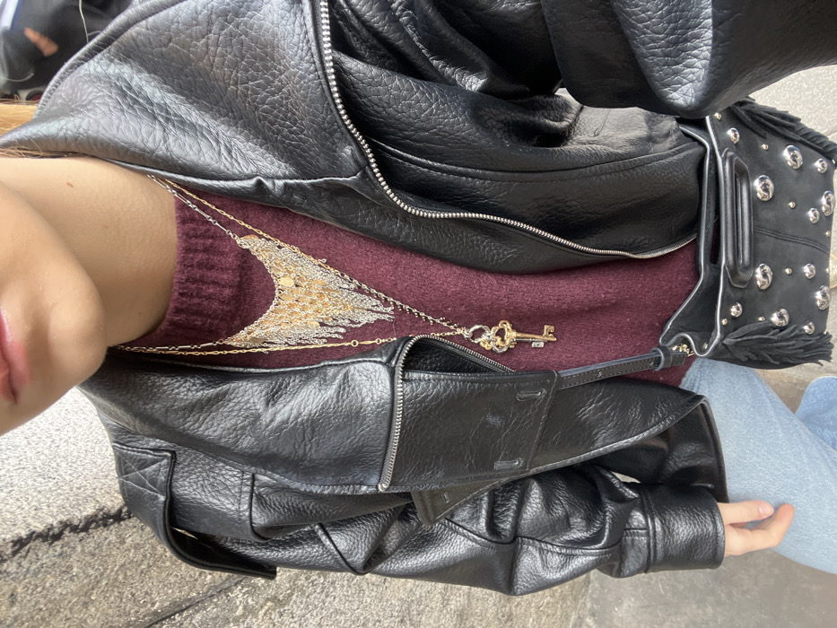 A partial view of an individual is depicted from the upper chest to the waist, standing outdoors against an indistinct, textured stone or concrete wall. The person, appearing female, has only the lower portion of their face, including the lips and chin, visible at the top of the frame. They are wearing a black, textured faux leather jacket with an open collar and visible shoulder epaulets, worn open over a deep red or burgundy turtleneck sweater. Light blue denim jeans are visible below the jacket. Two necklaces are worn: an elaborate, multi-layered piece featuring numerous thin gold and silver-toned chains forming a bib-like structure with small disc embellishments, and a longer, thinner chain with an antique-style gold key charm and a silver ring component. A black shoulder bag with a thin strap is visible, featuring numerous silver-colored studs on its front surface, a central handle, and fringe detailing on its sides. The bag rests on the left side of the individual. The lighting suggests daylight. No specific landmarks are present to pinpoint the exact location within the city of Madrid, Spain. The individual appears to be posing for a photograph.