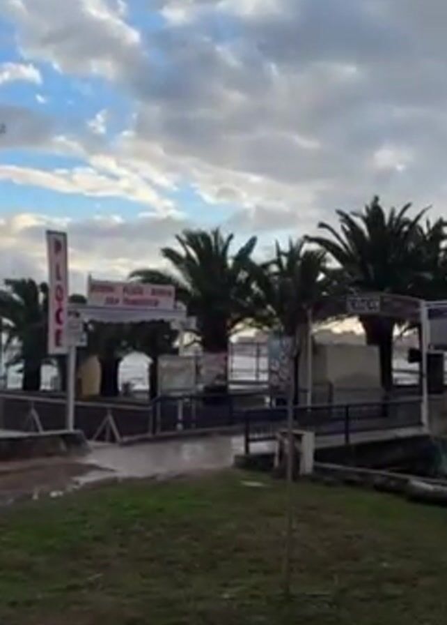 view of the beach and waterfront at Budva, Montenegro on a cloudy, windy day. In the foreground there is wet green grass and a small sapling tree. A paved area leads towards the water, with puddles on it. The beach itself is visible, with waves crashing on the shore. Several palm trees are visible, along with signs directing visitors to "Ploce - Budva Sea Transfer," and a sign for "COCO." In the distance, islands are visible in the sea. The camera pans slightly to the left, revealing a streetlamp.