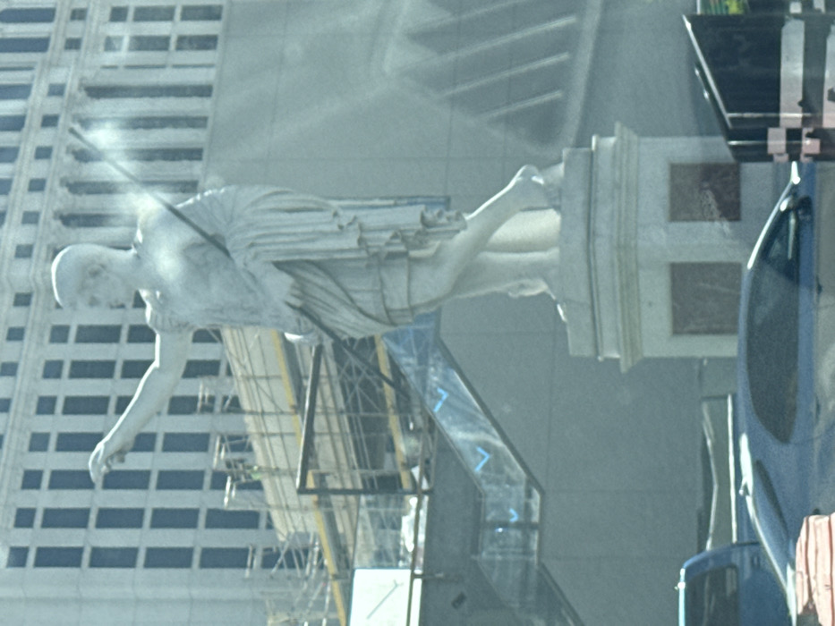 This image depicts a large white marble statue of a Roman emperor, consistent with Augustus Caesar, standing on a multi-tiered pedestal in the city of Paradise, United States of America. The statue faces slightly right, extending its left arm with an outstretched index finger and holding a staff or spear in its right hand, partially obscured by sun glare. In the background, the prominent, light-colored facade of Caesars Palace is visible, characterized by numerous rectangular windows and classical architectural elements. Below the main building, scaffolding indicates ongoing construction, and a glass-sided escalator with blue directional arrows ascends. In the immediate foreground, the front section of a light blue pickup truck and the roof of a dark blue sedan are partially visible. The scene is illuminated by strong daylight, creating significant reflections and glare across the image, suggesting it was captured through a window.