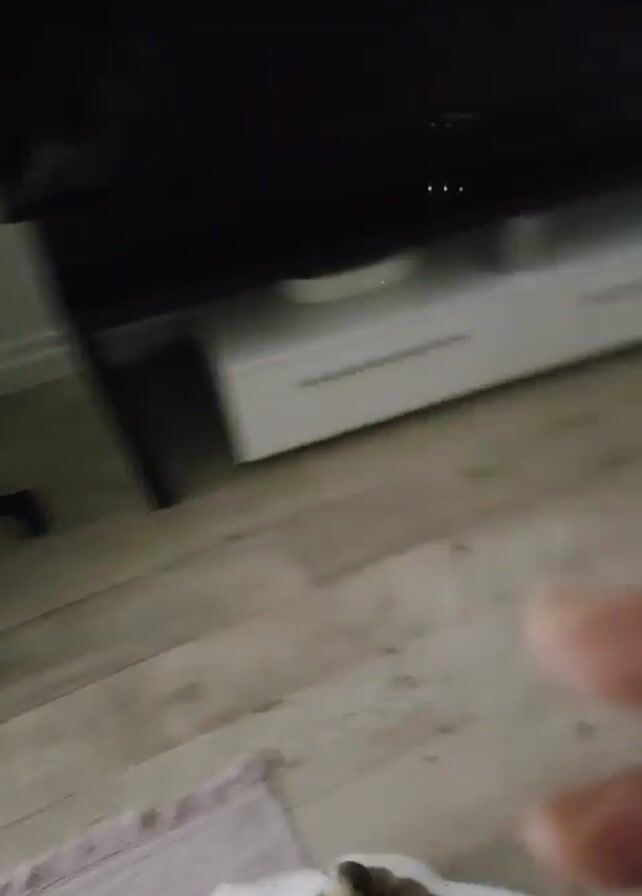 The video depicts a cat with white fur and brown and black patches walking on a light-colored wooden floor. The camera follows the cat, capturing its movements as it walks across the room. In the background, there's a black office chair with a pink shirt on it, a TV stand with a TV on it, and a table with black legs. The person holding the camera is wearing a brown garment and a black sandal with a brace. The room appears to be a living or dining area.