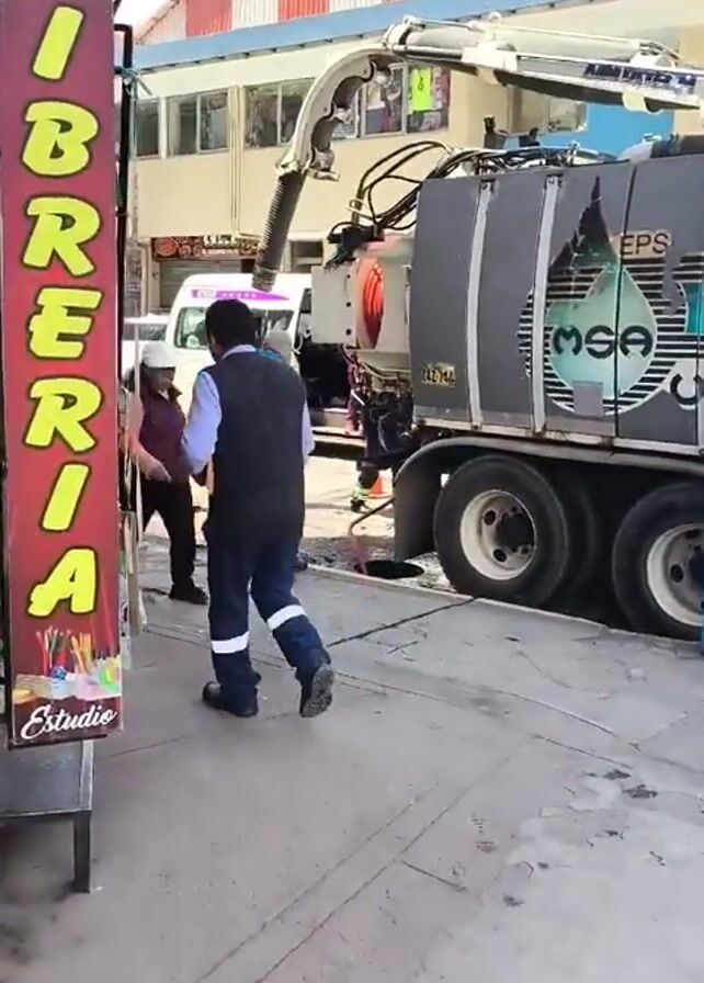 two men working around a large truck with a tank mounted on the back. The truck is parked on a concrete surface next to a sidewalk and a street. The truck is marked with "EPS MSA" and a logo featuring a water droplet. A man in a vest and jeans walks towards the truck in the first seconds of the video. Another man, wearing a blue hard hat and a grey jumpsuit with reflective stripes, is seen near the back of the truck. The truck appears to be some type of sanitation or service vehicle. A blue and white-striped pole stands next to the truck. Buildings are visible in the background.