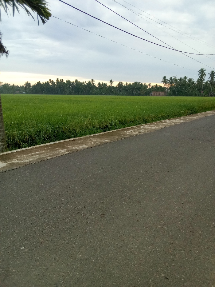 The image displays a panoramic view in Mns Alue, Indonesia. An asphalt road occupies the foreground, bordered by a concrete drainage channel on its left edge. Beyond the channel lies an expansive green cultivated field, likely a rice paddy, stretching towards the horizon. The horizon is marked by a dense line of tropical trees, predominantly palm trees. Within this tree line, a small, light-colored structure is partially visible on the far left, and a multi-story, light brown building is situated towards the center-right. The sky is overcast with gray and white clouds, featuring a faint yellowish hue near the horizon. Multiple dark utility lines traverse the upper portion of the sky. An out-of-focus dark palm frond partially obscures the upper left corner of the frame. No individuals, actions, or interactions are visible.