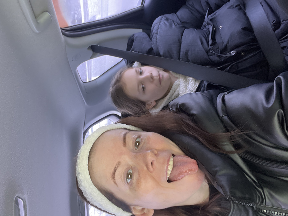 This image depicts two females inside a vehicle located in the city of Селычка, Russia. The individual in the foreground is an adult female with brown hair, wearing a white fuzzy headband and a black puffer jacket. She is facing the camera directly, extending her tongue in a playful gesture. To her right and slightly behind is a younger female with light brown hair, dressed in a dark puffer jacket over a cream-colored fuzzy garment. She is secured by a dark seatbelt across her chest and shoulder, looking towards the right of the frame with a neutral expression. The vehicle interior features a light gray headliner, and blurred bright light from outside is visible through the car windows, suggesting an overcast or possibly snowy outdoor environment.