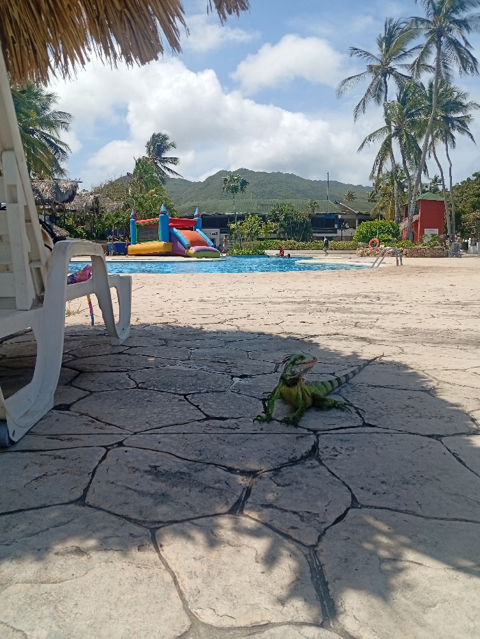 A green iguana basks on patterned stone pavers, its striped tail stretching away from the camera. A white lounge chair sits under a straw umbrella to the left. Beyond the iguana, a blue pool reflects a colorful inflatable slide, palm trees, and a mountain range under a partly cloudy sky. Several structures surround the pool, one painted red. A few people are visible near the water.
