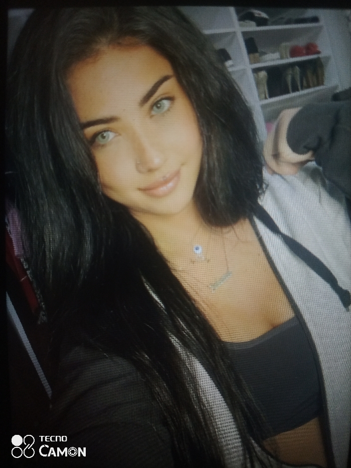 The image displays a female individual, positioned from the chest up, in an indoor setting within the city of Zango-ndaji, Nigeria. The subject has long, dark hair, light blue-green eyes, and a fair complexion. She is observed looking directly at the camera with a faint smile, her lips appearing glossy. A small piercing is visible on her left nostril. She is attired in a dark-colored bandeau-style top, overlaid with an open light grey hooded sweatshirt featuring black drawstrings. Two necklaces adorn her neck: one with a small blue "evil eye" pendant, and another with a horizontal bar pendant. Her right arm is partially visible on the right side of the frame, bent at the elbow. The background, slightly out of focus, features a white shelving unit stocked with various items, including footwear and a red cap. A "TECNO CAMON" watermark is present in the lower-left corner of the image.