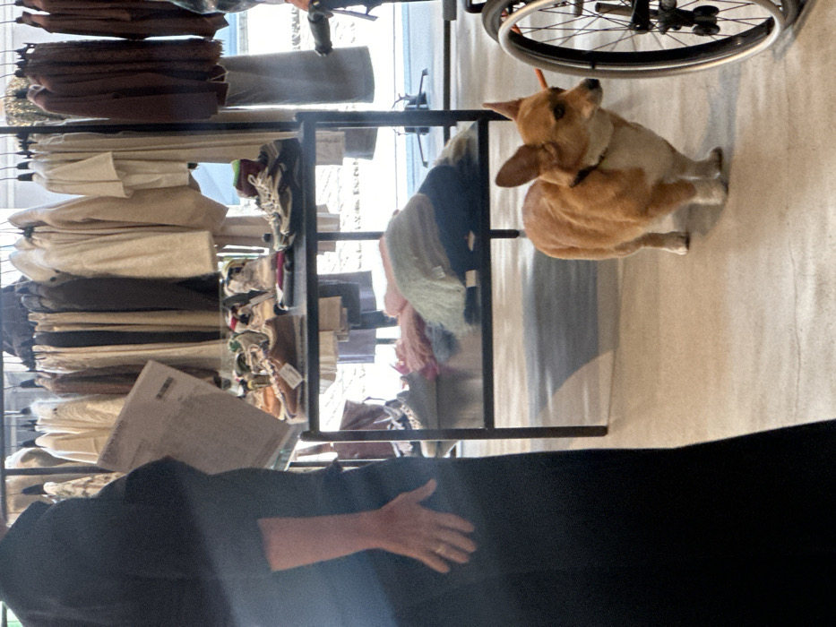 This image depicts an indoor retail space in Antwerp, Belgium. The scene is illuminated by natural light, casting shadows on a light-colored concrete floor. On the far left, a person is partially visible from the mid-torso down, wearing dark, possibly black, attire. Their left arm is visible, with a ring on the left ring finger, and they are holding a white document or paper in their left hand. In the background, multiple clothing racks display garments primarily in muted, neutral tones such as creams, browns, and light grays. In the center, a black metal multi-tier display unit is prominent. Its upper shelf holds several pairs of sneakers, including brown, white, and black models, some with visible price tags. One pair of sneakers contains a green sock. The lower shelf of this unit displays folded textile items, possibly scarves or blankets, in shades of pink, blue, and cream/beige. In the foreground, a fawn and white Pembroke Welsh Corgi wearing a dark collar stands on the floor, facing towards the right side of the frame. To the far right, partially visible, is the right wheel and frame of a black wheelchair or stroller.