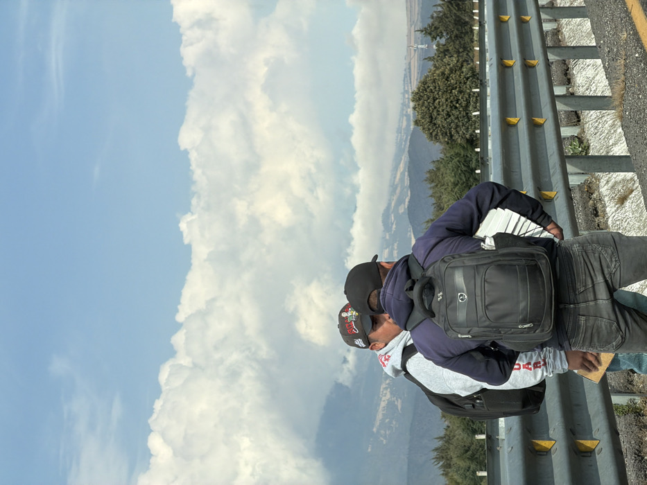 Two people stand near a guardrail on the side of a road. One person wears a black hat, backpack, dark shirt, and jeans. The other person wears a baseball cap, gray hoodie, backpack, and jeans. The sky has blue patches and fluffy clouds. Mountains and green trees are visible in the background. The guardrail is metal with yellow reflectors.