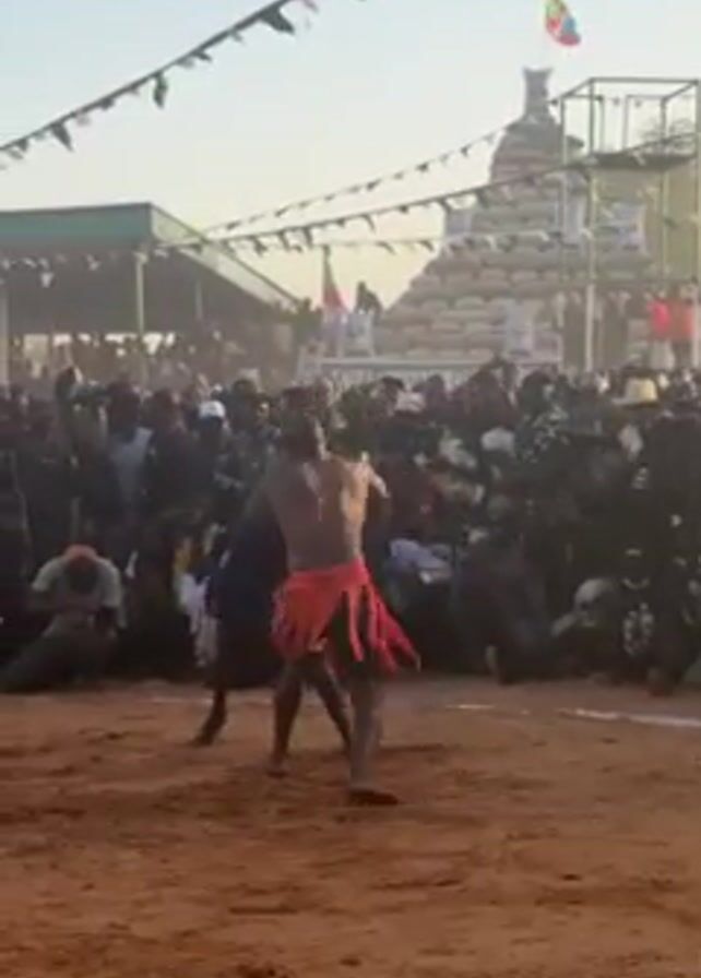 Two shirtless men face each other in a sandy ring in the center of a crowded outdoor area. The man on the left wears blue fabric wrapped around his waist, while the man on the right wears red. Both men have their hands raised and appear to be boxing or wrestling, though they are not making contact at the moment. The surrounding crowd is dense, with many people dressed in dark clothing. Several individuals are filming the scene with their phones. Banners and flags hang overhead, and a large pyramid-shaped structure is visible in the background. A structure covered with a green tarp is also visible behind the crowd. The sky is clear and the lighting indicates it is likely daytime.