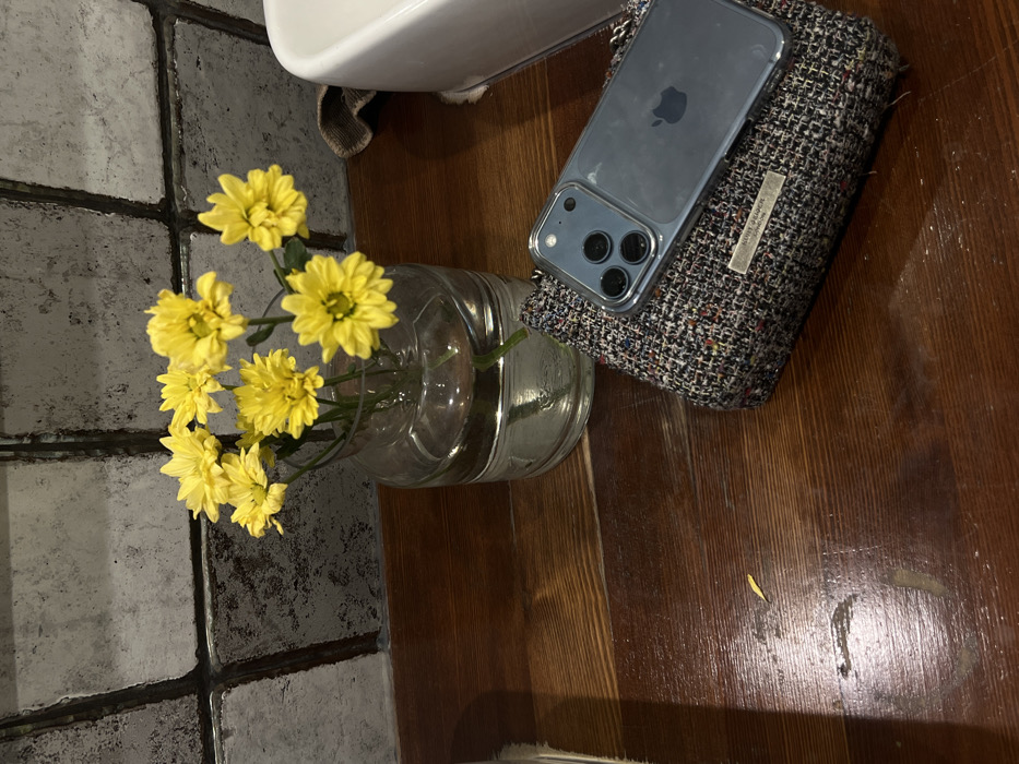 The image displays an indoor still life. In the background, a wall is composed of distressed grey rectangular panels or tiles separated by dark grout lines. A dark brown wooden surface, possibly a countertop or table, occupies the midground and foreground, featuring a glossy finish and visible wood grain with minor wear. Centered on the wooden surface is a clear glass vase, approximately half-filled with water, holding a bouquet of approximately six to eight yellow chrysanthemum-like flowers. To the right of the vase, a small, rectangular bag or clutch made of multi-colored tweed-like fabric (grey, black, white, red, blue flecks) is positioned. A silver rectangular plaque, bearing the text "SWISS GRACEN," is affixed to the front of this bag. An iPhone, identifiable as a Pro model by its three distinct rear camera lenses arranged in a triangular cluster within a square module, lies face down on the tweed bag. The phone is dark-colored and encased in a clear protective cover, with the Apple logo visible through the cover. A single yellow flower petal rests on the wooden surface in the lower-left area of the frame. A portion of a white ceramic basin or sink is visible in the upper right corner, accompanied by a dark, crumpled piece of fabric. No individuals are present. The precise location within the city of Yerevan, Armenia, cannot be determined from this generic interior scene.