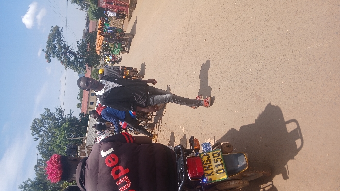 This image depicts a street scene in Kisii Central ward, Kenya, during daylight hours under a bright blue sky with scattered clouds