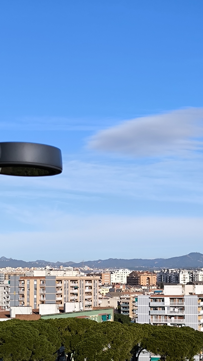 A vertical photograph captures an elevated perspective of Cerdanyola del Vallès, Spain, under a clear, bright blue sky with sparse, wispy white clouds and one distinct, elongated cumulus cloud positioned centrally in the upper-right quadrant. In the extreme upper-left, a partial view of a dark grey, circular, flat-bottomed object, likely a component of a light fixture or surveillance device, extends into the frame. The lower half of the image depicts a dense urban environment. A prominent band of dark green, densely packed trees, consistent with conifers, forms the immediate foreground, obscuring the ground level directly beneath. Beyond this foliage, numerous multi-story residential and commercial buildings populate the midground and background, exhibiting various architectural styles and colors, predominantly beige, grey, white, and terracotta, many featuring balconies. In the distant background, a range of hazy blue mountains or hills is visible along the horizon. The scene is brightly illuminated by direct sunlight, indicating daytime. No individuals or specific actions are discernible within the frame.