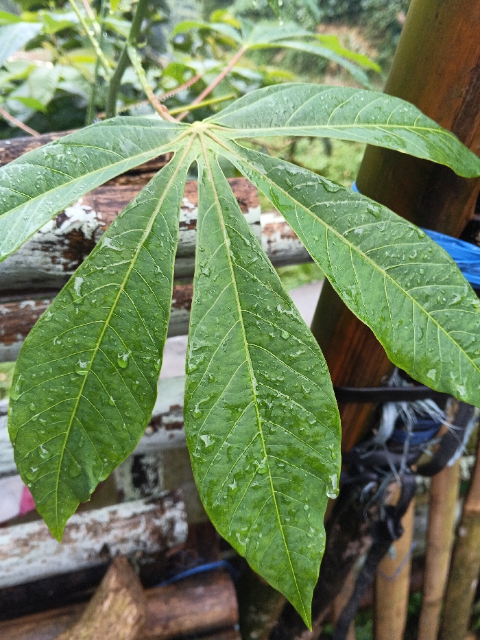 - "A close-up, downward-angled view captures a large, vibrant green cassava leaf, deeply lobed with seven distinct leaflets fanning out from a central petiole" by FM-cIHJ92, licensed under CC BY 4.0