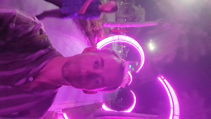 The image depicts a nighttime scene in Ha Long Ward, Vietnam, characterized by strong magenta artificial lighting. In the immediate foreground, a male individual faces the camera, likely taking a selfie. He has short dark hair, light facial stubble, and is wearing a dark, possibly striped, collared shirt with a single button visible. His expression is neutral. To the left in the mid-ground, a blurry female figure is partially visible, facing away and walking left, wearing a dark patterned top. The background features a series of prominent, C-shaped or crescent-shaped light installations, glowing intensely magenta, lining a paved walkway. Beyond these lights, palm trees, standard streetlights, and faint lights from vehicles on a road are discernible. Low-level vegetation borders the walkway. The sky is dark.