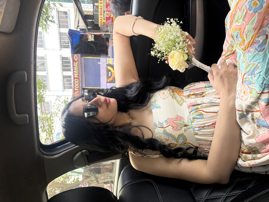 A female individual with long, dark, wavy hair, wearing dark sunglasses with a metallic frame, is seated in the front passenger seat of a vehicle. She is clad in a light-colored, patterned, sleeveless dress featuring botanical motifs. Her left arm rests on the vehicle's interior door frame, while her right hand holds a small floral arrangement consisting of one pale yellow rose and multiple white baby's breath flowers, with a metallic-wrapped stem. A beaded bracelet is on her right wrist, and a ring is on her left ring finger. Through the passenger window, an urban street scene in New Town, India, is observed under daylight conditions. Visible elements include a distant white multi-story building, a roadside establishment marked "FOOD MAHAL" with a red sign, a blue tarpaulin, and a "BHAI BHAI SHOP" sign displaying a phone number. A portion of another individual's head is visible externally on the lower right. The vehicle's interior features dark, stitched upholstery on the seat.