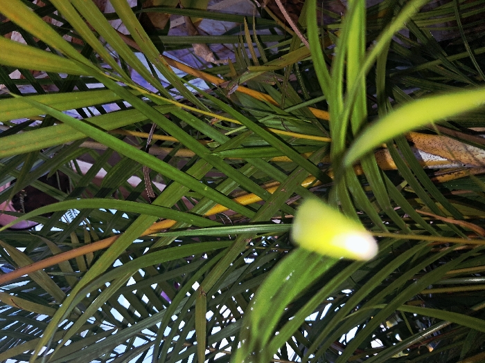A dense cluster of green and yellow palm fronds fills the frame. Linear leaves crisscross, obscuring the background. A single, unfurled bud with a pale yellow tip stands out in the foreground, slightly blurred. Some fronds display a yellowish tinge. The light source is subdued, casting soft shadows.
