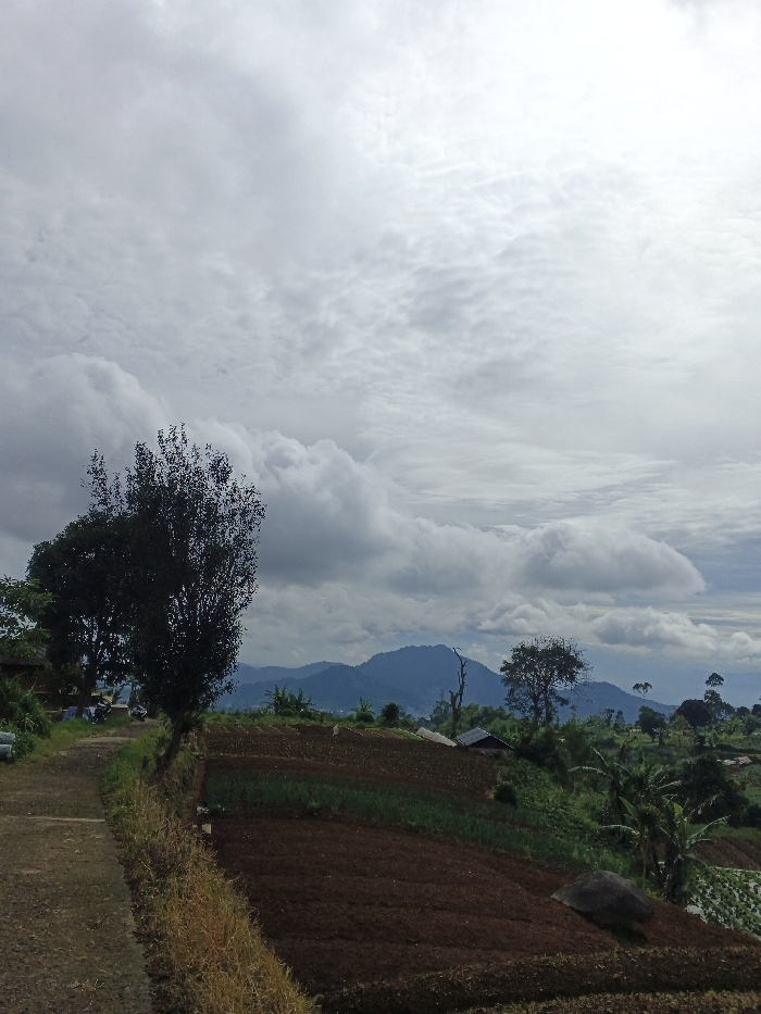 A landscape showcases agricultural terraces on a gentle slope under a cloudy sky. Mountains form a backdrop in the distance, partially obscured by the cloud cover. A prominent tree stands to the left of the frame, bordering a path. Several smaller trees dot the hillside. Buildings are scattered among the greenery, suggesting a rural setting. A large rock is visible within the terraces.