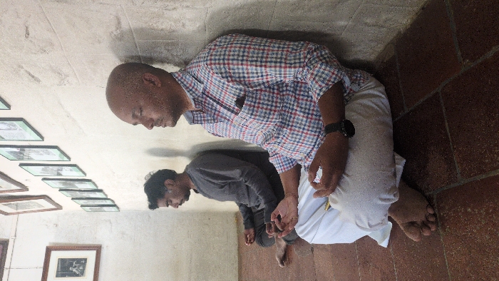 Two barefoot men are indoors in traditional clothing, heads bowed, possibly praying or meditating. The man in the foreground wears a plaid shirt and white dhoti. The other wears a gray top and dark pants. Framed photos line the wall to the left. The floor is reddish tile.