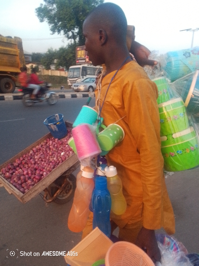 A man in a mustard-colored shirt stands next to a road, burdened with goods. A wooden cart loaded with onions rests to his left. He carries cups, water bottles, and plastic containers suspended from his neck and arms. Traffic, including a truck and a motorbike carrying two people, moves in the background. A billboard is visible above a white bus and a silver car. The bottom of the image includes a watermark.