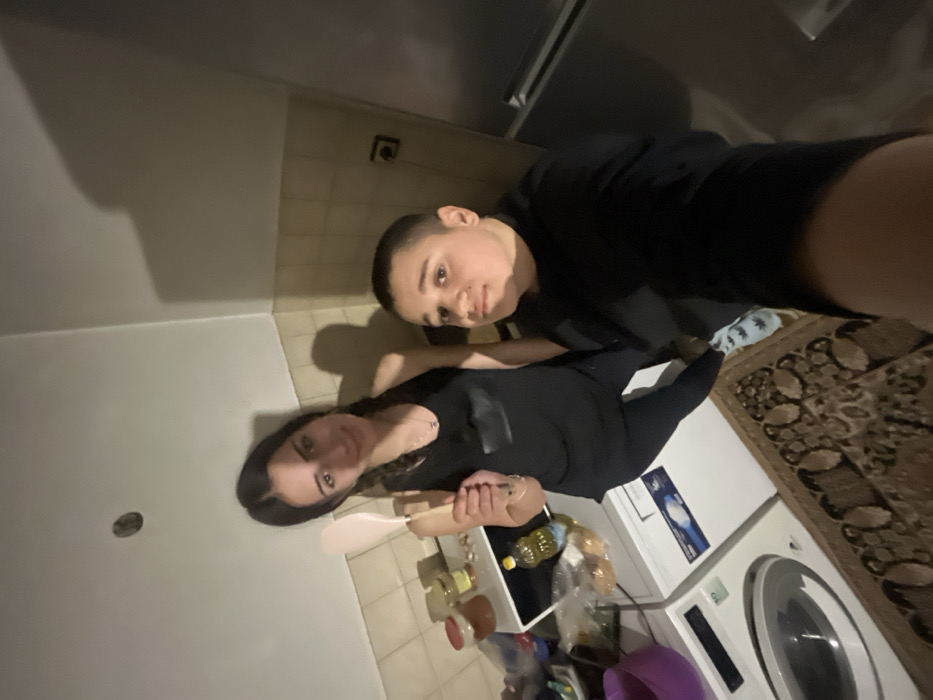 Two individuals are pictured in what appears to be a kitchen setting in Lozarevo, Bulgaria. The female, positioned to the left, has dark hair in two braids, wears a black tank top and dark pants, and holds a light-colored spatula in her right hand. She is looking towards the camera with a slight smile. The male, positioned to the right and closer to the camera, has short dark hair, wears a black long-sleeved shirt and dark pants, and light blue sneakers with a subtle leaf pattern. He looks towards the camera with a neutral expression. The background consists of white walls, transitioning to a light brown tiled backsplash in the upper right corner. A distinct dark shadow is cast on the wall behind the individuals. To the left, a white front-loading washing machine is visible, with a purple container on the floor beside it. On a surface behind the female, a white appliance (possibly a microwave), multiple glass jars (one with a red lid), a clear plastic bottle of cooking oil, and a plastic bag containing bread or pastries are arranged. A stainless steel refrigerator is partially visible on the far right. The floor is covered with a patterned rug in shades of brown and black. The scene is illuminated by an unseen light source, casting visible shadows.