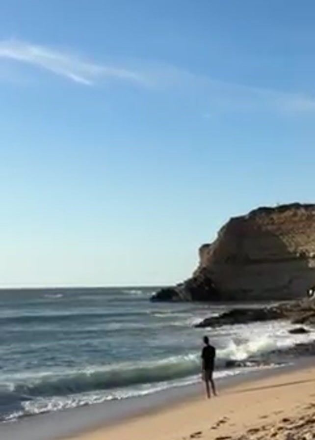 The video depicts a person standing on a sandy beach near the water's edge, looking out towards the ocean. The sky is a clear blue with some wispy clouds. To the right, a rocky cliff formation juts out into the sea. Gentle waves roll in and break on the shore. The person is dressed in dark clothing.