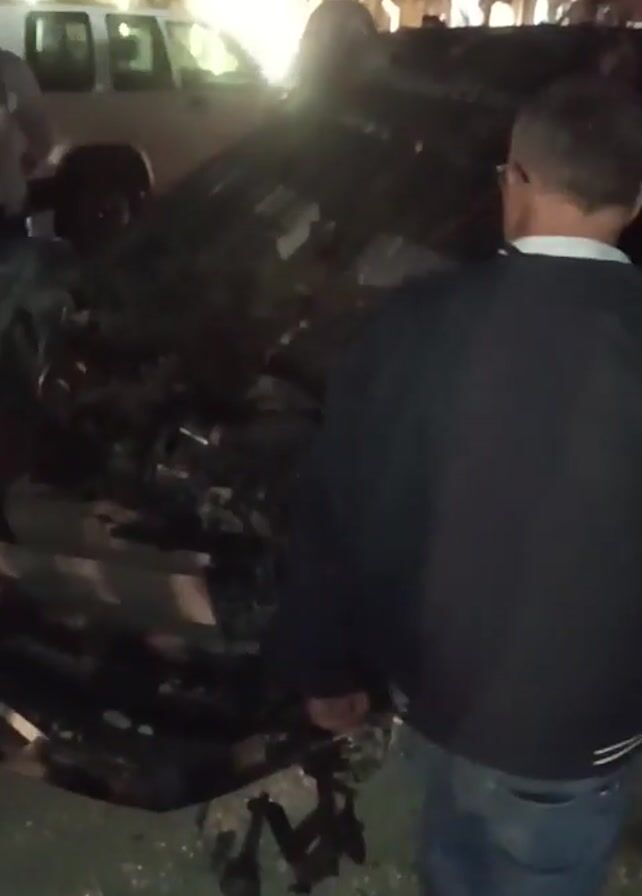 car accident scene at night. A black car is overturned on a grassy area, its underside heavily damaged. Several people are standing around the wreckage, observing. The setting appears to be an urban area with buildings and streetlights visible in the background. One man is wearing a dark jacket and jeans, another is in a grey sweater and patterned pants, and a third man wears a blue shirt and cap. The focus is on the damaged vehicle and the onlookers.