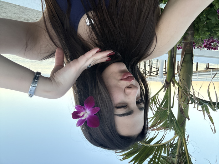 The image captures a female individual posing outdoors at what is identified as the Malibu Pier in Malibu, California, United States. The subject, positioned centrally in the foreground, has long dark hair and wears a dark blue garment. A purple orchid is secured in her hair above her left ear. She is winking with her right eye and her lips are pursed. Her right hand is raised, fingers slightly splayed, with the thumb touching her right shoulder area. A silver-toned bracelet with rectangular links is visible on her right wrist, and a silver heart-shaped pendant hangs from a necklace. In the mid-ground, a white wooden pier extends over calm ocean water. Pilings and the pier deck are visible. To the left, a palm tree trunk is partially visible. Further left and lower, purple flowering plants are seen behind a white railing. The sky is clear, displaying a light blue hue transitioning to a warmer, yellowish tone near the horizon, indicative of late afternoon or early evening lighting conditions.