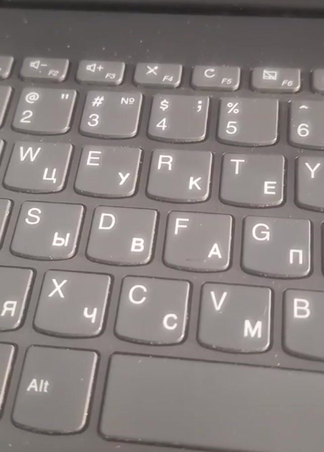 A close-up shot displays the keyboard of a black Lenovo laptop. The keys are gray with white lettering and show both Latin and Cyrillic characters. The lighting is even, and the camera remains still throughout the shot. The keyboard appears slightly dusty. No actions or interactions occur in the frame.