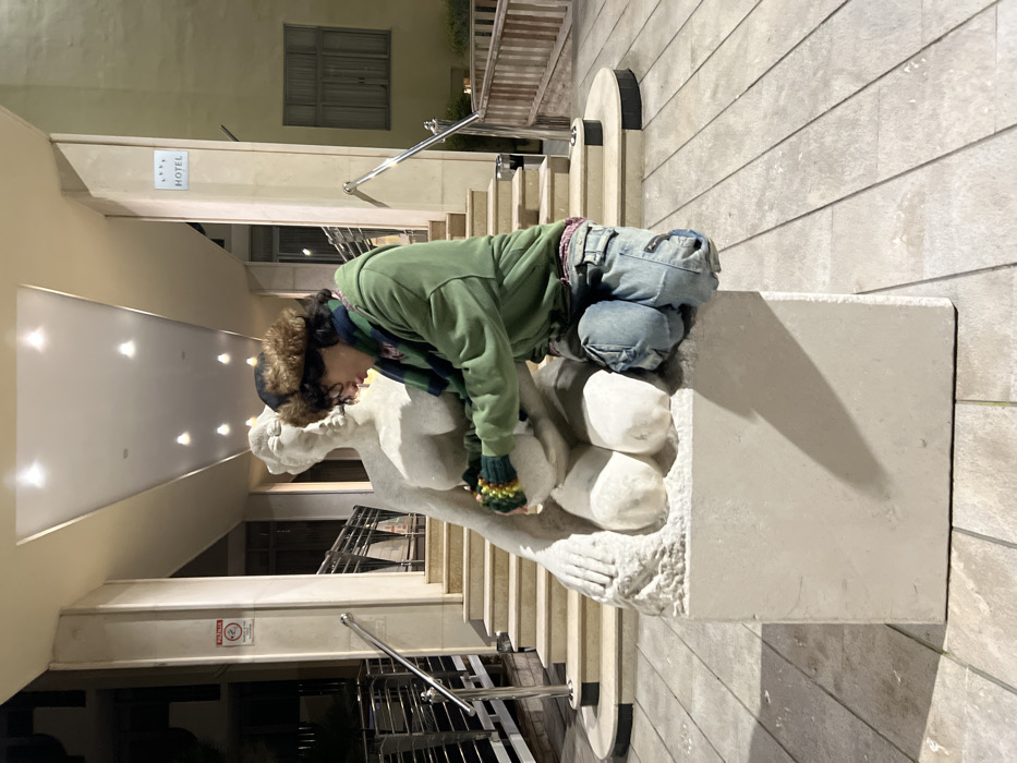 A person in a green jacket, blue jeans, fur hat, scarf, and multi-colored fingerless gloves is crouching on a white stone statue. The statue depicts human figures. The setting appears to be in front of a building, possibly a hotel, suggested by a sign on the building's facade. Stairs with metal railings lead to the building's entrance. The surrounding area seems illuminated by artificial lighting, casting shadows on the ground and building.