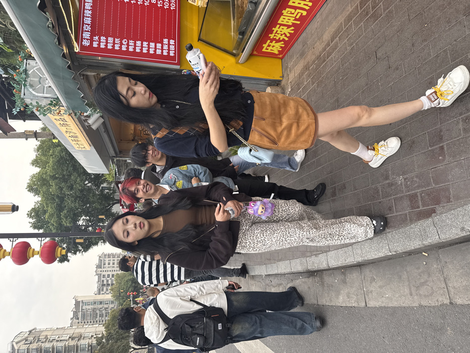 An overcast daytime scene depicts a busy street in Qinhuai District, China, featuring pedestrians and commercial establishments. In the foreground, two young East Asian females walk along a paved sidewalk adjacent to a street. The female on the left has long, dark hair and wears a dark brown zippered hoodie over a brown top, leopard print trousers, and black clogs. She carries a small purple fuzzy rabbit-shaped pouch in her left hand and a small white object in her right. Her expression is neutral. The female on the right, also with long, dark hair, wears a navy blue argyle-patterned V-neck cardigan, a brown suede mini-skirt, white socks, and white sneakers with yellow laces and "Miu Miu" branded tags. She carries a light blue quilted shoulder bag and is focused on a white plastic bottle and a smartphone held in her hands. Behind these individuals, several other pedestrians are visible. Notable figures include a male with red dyed hair and a denim jacket smiling towards the camera, and another male wearing glasses and a dark top also smiling. Further back, a male with a black backpack and white hoodie, and another in a striped shirt, walk away from the viewer. To the right, a commercial food stall is visible with a prominent red sign displaying "老南京麻辣鸭鸭" (Old Nanjing Spicy Duck) and a menu listing various duck parts such as duck head, neck, liver, intestines, gizzard, wings, feet, intestine plate, and leg bone, along with their prices. A glass display case below the sign shows prepared food items. Above this, an awning covers another sign with Chinese characters indicating "Designer Nansha's Accessories." The street area includes a grey concrete curb separating the asphalt road from the brick-paved sidewalk. Overhead, two red Chinese lanterns with yellow tassels hang from a pole, accompanied by other streetlights. In the distant background, multi-story buildings and trees are visible under the overcast sky. A few cigarette butts are discarded on the curb.