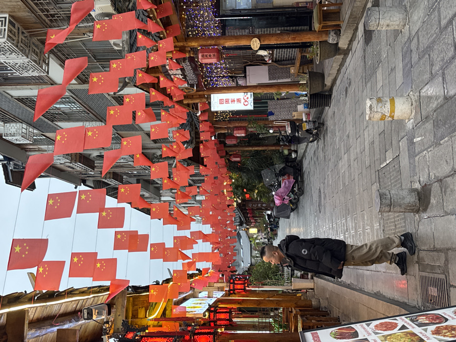 This image depicts a pedestrian street within the city of Zhangjiajie, China. The scene is characterized by a dense overhead canopy of small red flags of the People's Republic of China, each displaying a large yellow star and four smaller yellow stars, strung across the street. On the left side of the paved stone street, a commercial establishment with traditional wooden architecture is visible, featuring multiple red lanterns, wooden tables, and a vertical menu board displaying food items. A solitary male individual stands on the left side of the street, facing right. He has short hair with shaved sides, wears a dark puffer jacket, light-colored trousers, and dark athletic shoes. He appears to be observing something out of frame to his right. The right side of the street features multi-story buildings with windows and a shopfront adorned with string lights and additional red lanterns. Several scooters, some covered with pink tarps, are parked along this side. Potted plants are spaced along the storefronts. The street surface is paved with grey rectangular stones, and three concrete bollards are positioned in the foreground, one exhibiting yellow and white paint. The sky above is overcast.
