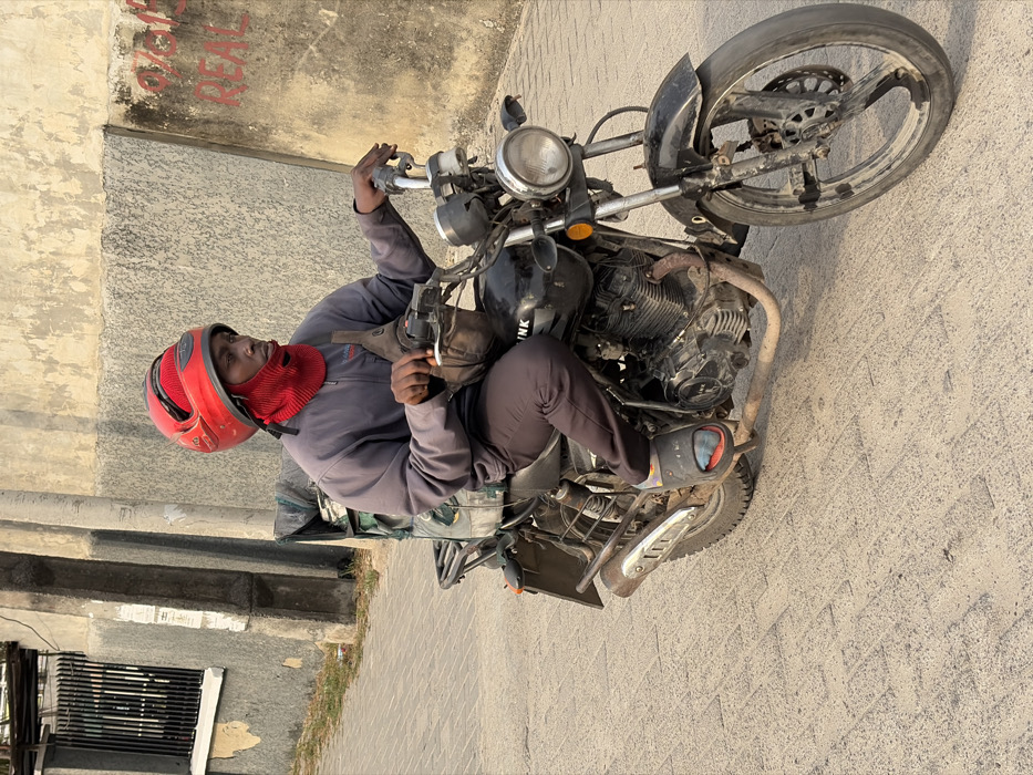 A man wearing a red helmet and neck covering is on a black motorcycle. He's dressed in a gray jacket and dark pants. The motorcycle appears aged and slightly damaged. They are situated on a paved surface near a concrete structure with graffiti. The photo's orientation is tilted, with the motorcycle leaning slightly to the side.