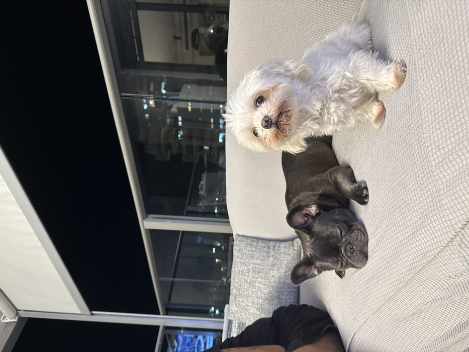 The image displays an elevated outdoor living space, likely a balcony or terrace, in the city of Holon, Israel, observed during nighttime. On a light grey, textured outdoor sofa, two dogs are positioned alongside a partially visible individual. To the left, a dark grey French Bulldog lies prone with its eyes closed, appearing to be asleep or resting. To its right, a white, shaggy-haired Maltese-type dog sits upright, facing slightly left and upwards. This dog exhibits reddish-brown tear staining around its muzzle. A person's lower left torso and leg, clad in dark attire, are visible on the far left of the sofa, behind a grey patterned throw pillow. The background reveals a dark night sky above an urban panorama, characterized by numerous illuminated buildings and distant city lights, visible beyond a clear glass railing with metallic supports. A white retractable awning or blind is partially visible along the top edge of the frame. Reflections of an interior space are also discernible on the glass elements in the background.