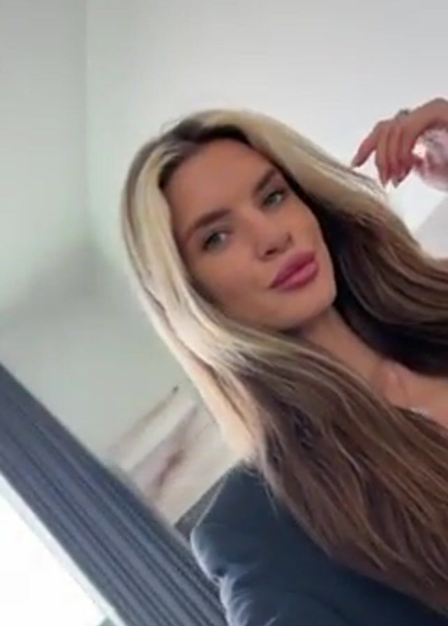 A woman with long, blonde-streaked brown hair, wearing a black jacket, a white top, and jewelry is looking at the camera. She has light blue eyes and is wearing pink lipstick. She touches her hair with her right hand. A window with closed blinds is behind her on the left. The ceiling is white.