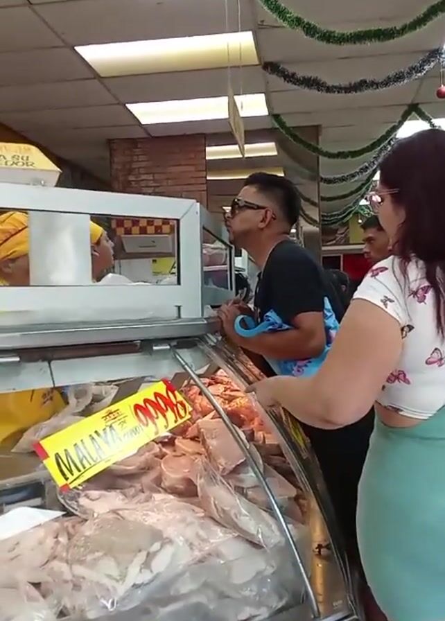 A shopper in sunglasses leans over a refrigerated display case filled with packages of meat at a butcher counter. The shopper is talking to a butcher wearing a yellow hat who is inside the enclosed counter. Another shopper stands nearby and observes, as does another man in the background. The butcher reaches out to hand the shopper a package of meat. Christmas decorations hang from the ceiling. A yellow sign on the display case advertises “Malaya” for “9998”.