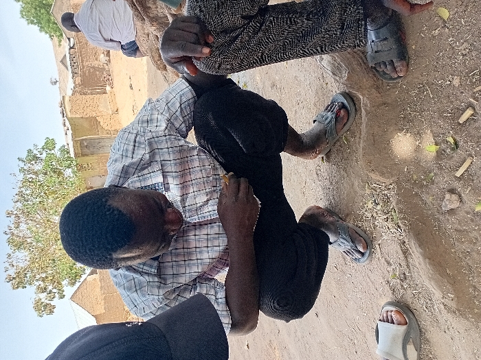 An outdoor scene in Nata-Ala, Nigeria, depicts an adult male in a deep squatting position on dry, light-brown earth. He wears a plaid short-sleeve shirt, dark pants, and gray flip-flops, looking down at his hands which hold a small, light-colored object. Partially visible to his immediate left is a dark baseball cap worn by another individual. To his immediate right, a leg wearing patterned trousers and a dark sandal is visible. The ground contains scattered small green leaves, several short, light-colored cylindrical organic pieces, and small earthen mounds. In the mid-ground, a larger-built male in a light-colored shirt sits on a raised earthen structure, facing away from the camera. The background features several single-story, light brown mud-brick buildings with simple roofs, and a sparse tree with green foliage, all under a clear sky.