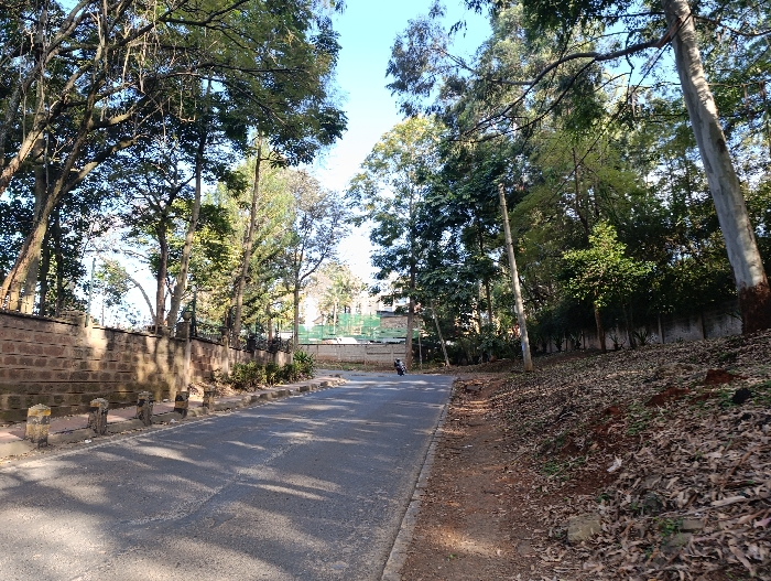 The image displays a tree-lined asphalt road on a clear, sunny day in Nairobi, Kenya