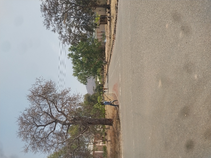 A daytime outdoor scene features a wide asphalt road taking up most of the frame. To the left, trees line the edge, some with bare branches and others with green foliage. Buildings are visible in the background behind the trees. A person stands near the trees beside the road. In the distance, a low mountain can be seen. The sky is overcast.