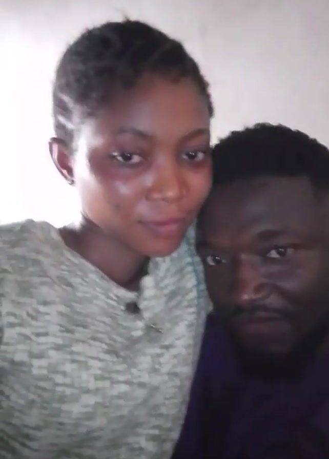A woman and a man are close together in the shot, facing the camera. The woman is wearing a patterned gray shirt, and her hair is pulled back. The man is wearing a dark shirt. Their faces are in focus, and there is a plain white wall in the background. They appear to be taking a selfie or recording a video together.