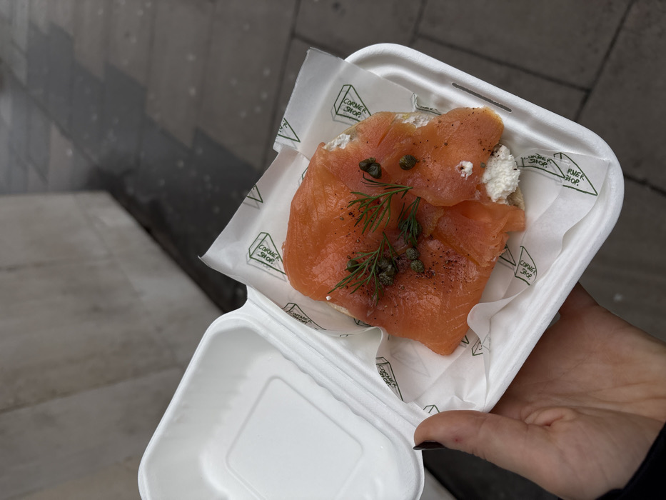 A light-skinned hand, featuring dark nail polish on the thumbnail, firmly grips a white disposable takeout container. Inside the open container, a bagel half is prepared with a layer of cream cheese, several slices of bright orange smoked salmon, scattered green capers, and sprigs of fresh dill, all seasoned with black pepper. The food rests on white wax paper printed with a repeating green triangular logo containing the text "CORNER SHOP" in white. The container's lid is open and positioned to the left. The background reveals an outdoor, urban environment in London, United Kingdom, characterized by grey paved flagstones on the ground and a light-colored stone or concrete building structure with vertical lines. The item originates from an establishment identified by the "Corner Shop" brand.