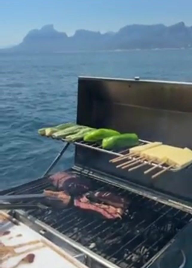 A stainless steel grill sits on a boat surrounded by a large body of water