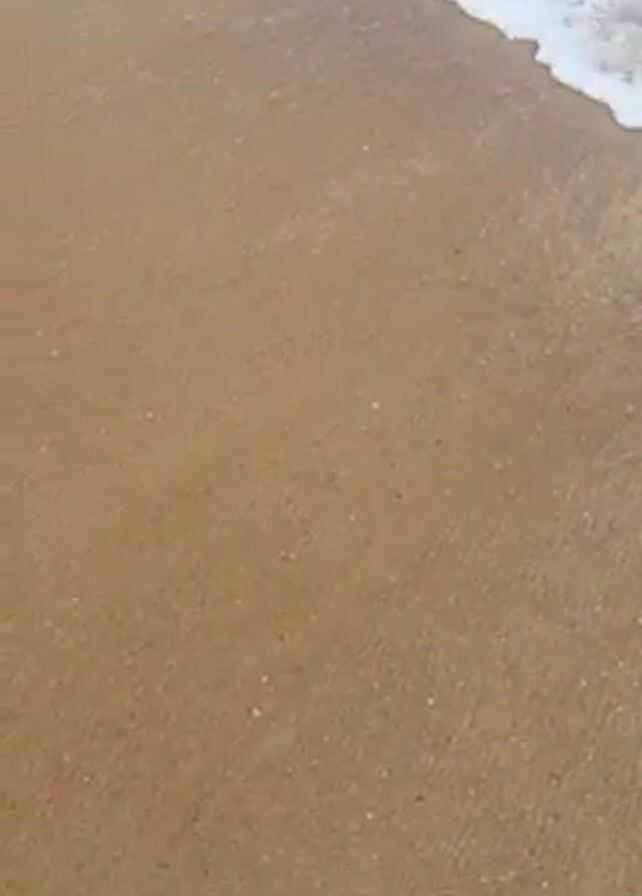 sandy beach with waves rolling in from the ocean. One foot is visible in the lower left corner of the frame. The sand is wet and packed. The waves are foamy and white. The ocean appears calm.