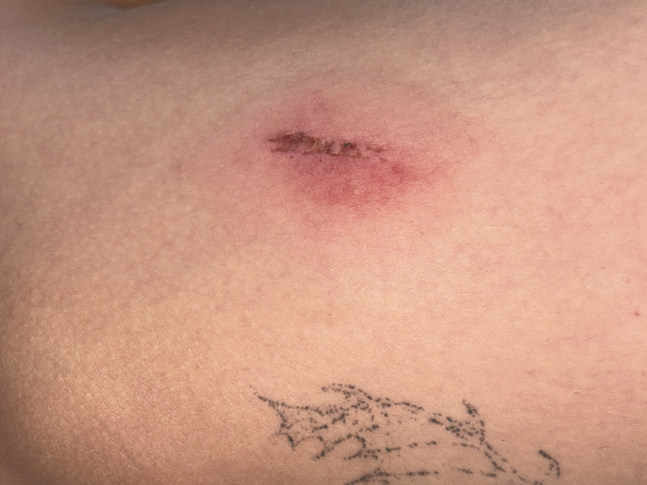 The image presents a detailed close-up of light-toned human skin, depicted as being in the city of Pai, Thailand. The central feature on the right side of the frame is a vertical linear skin lesion, approximately 2.5 to 3.0 centimeters in length. This lesion appears to be an abrasion or superficial laceration, characterized by a dark reddish-brown crust or scab formation along its length, indicating a process of healing. Surrounding the lesion is a distinct area of erythema, roughly 5 centimeters in its longest dimension, which suggests localized inflammation. On the upper left quadrant of the image, a partial view of a black outline tattoo is visible. The tattoo's design consists of complex, stylized organic patterns, potentially depicting part of a wing or an abstract botanical element. No other individuals, objects, active interactions, or external environmental details are discernible within the frame.