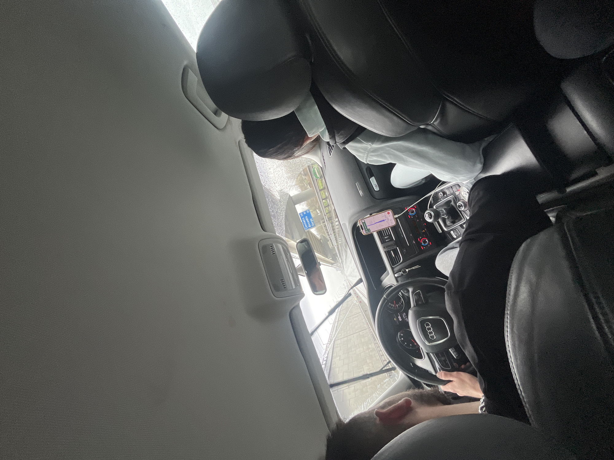 interior of a car, specifically an Audi, with the driver's seat occupied by a person wearing a light-colored shirt and dark clothing