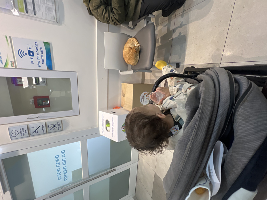 An indoor scene depicts a waiting area in what appears to be a medical clinic in Kiryat Motzkin, Israel