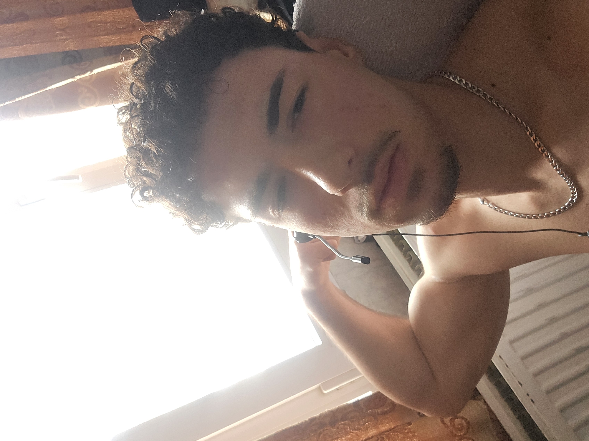 A male individual with dark, curly hair, a mustache, and a goatee is depicted in a close-up, indoor photograph, likely a selfie