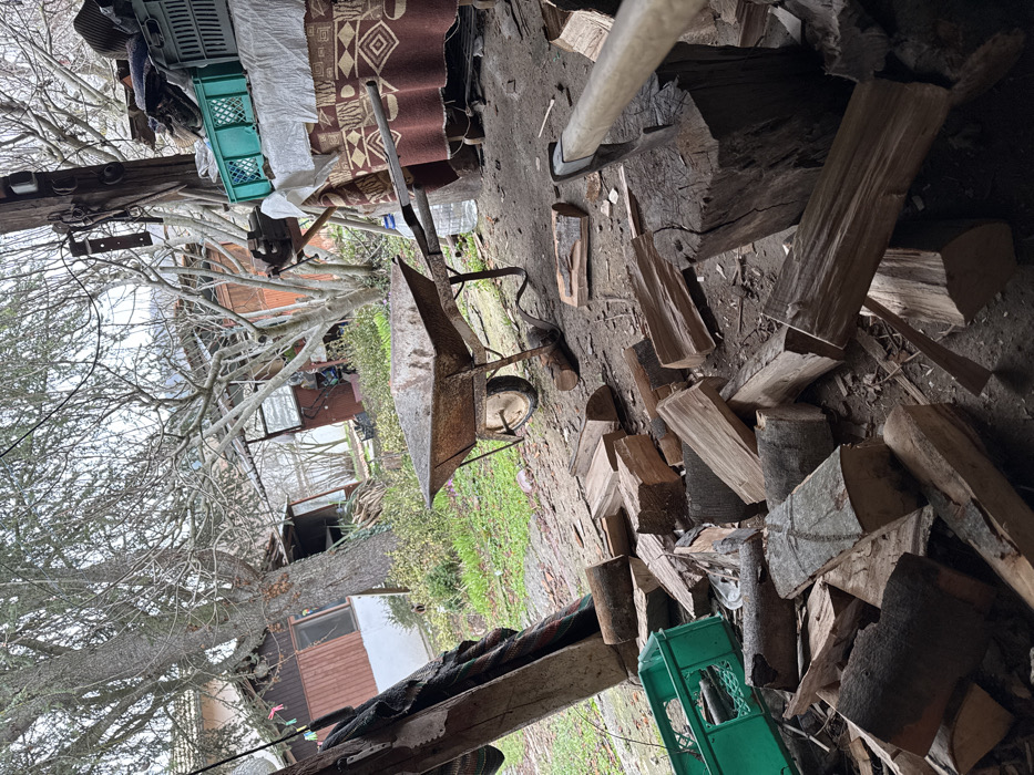 The image depicts an outdoor scene in Lozevo, Bulgaria, characterized by wood processing activities and various utilitarian items. In the immediate foreground, numerous split firewood logs are scattered across a dirt and debris ground. To the lower right, a large, dark wooden chopping block has a metal axe with a light-colored wooden handle embedded vertically into its top surface. Adjacent to the left, a green plastic crate is partially visible on the ground. In the mid-ground, slightly left of center, a rusty, single-wheeled metal wheelbarrow stands on the unpaved surface. Further to the right, a makeshift table or surface is covered with a patterned brown and off-white textile. On this surface, two green plastic crates are stacked. A clear plastic water bottle is positioned on the ground near the table. A weathered wooden vertical post or beam is also visible, supporting an overhead structure which casts shadow over the foreground. The background reveals a semi-rural environment under an overcast sky. Several bare deciduous trees, indicative of a colder season, dominate the upper portion of the frame. To the left, a rustic house or shed with reddish-brown wooden siding and a visible window is present. A clothesline with pegs is strung near this structure. Other partially obscured structures and light green grassy patches are visible further back. No individuals are present in the scene.